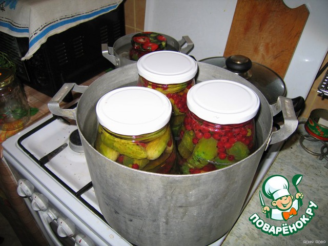 Банки простерилизовать, на дно уложить зелень, уложить огурчики, пересыпать красной смородиной. Всыпать 1,5 ложки крупной соли.