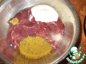 Куриную печень моем, обрезаем прожилки. Добавляем майонез, горчицу, хмели-сунели и соль. У меня хмели-сунели имеет в составе соль, поэтому я дополнительно соли добавляю всего пол чайной ложки без горки. Если у Вас хмели-сунели без соли, то кладите соли больше, чем я.