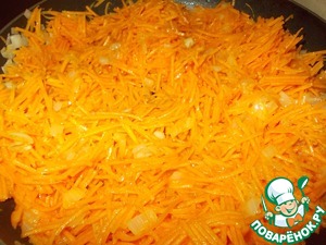 Затем к луку высыпаем натертую тыкву и перемешиваем.