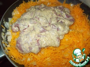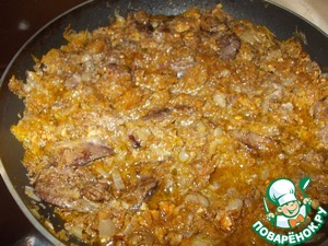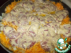 Теперь поверх тыквы с луком выкладываем замаринованную печень.