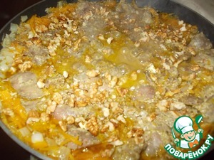 Через 15 минут крышку снимаем. Видим, что тыква и печень пустили сок. Посыпаем содержимое орехами и оставляем тушиться без крышки еще на 15 минут.