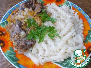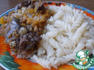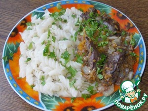 Готовим любой гарнир и оформляем порцию. В моем случае, на сегодня, в качестве гарнира макаронные изделия.