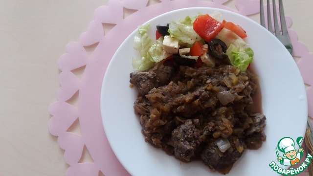 По прошествии времени видим, что лишняя жидкость испарилась, а подлива стала однородной. Кусочки печени при нажатии не выделяют кровь. Это признак того, что куриная печень на тыквенной подушке готова.