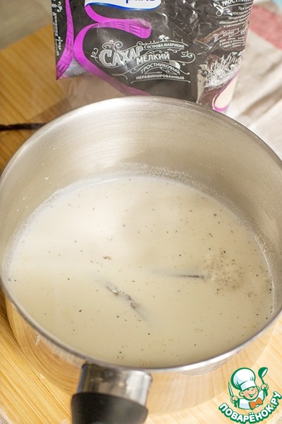 Ванильный стручок порезать вдоль на 2 части. Ножом соскоблить мякоть и отложить. Пустой стручок добавить в молоко.