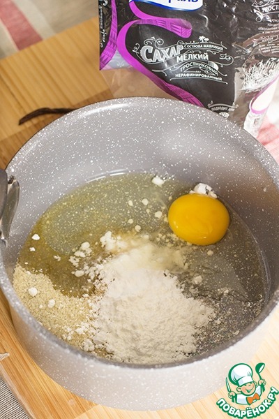 В отдельной кастрюле смешать коричневый сахар, яйцо и кукурузный крахмал.
