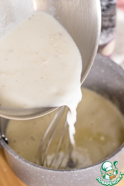 Вылить горячее молоко в предыдущую смесь (при этом вынуть стручок), перемешать венчиком и поставить на небольшой огонь. Варить при постоянном помешивании до начала загустения. Долго варить не надо, иначе крем будет слишком компактным. Сами выбирайте желаемую консистенцию, но имейте в виду, что при охлаждении крем тоже хорошо застынет.