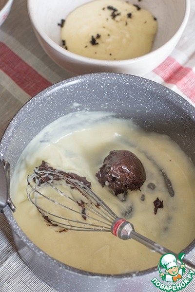 Поделить сваренный крем на 2 равные части. В одну половину добавить ванильную мякоть и перемешать.