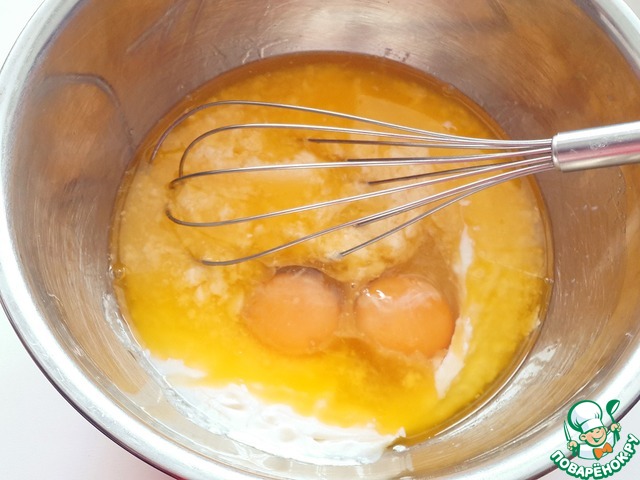 Растопите масло, добавьте к нему сметану и яйца, смешайте всё венчиком