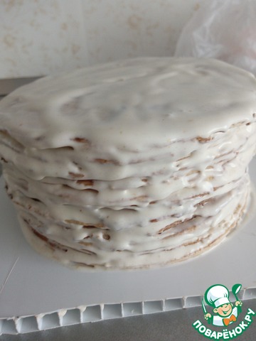 Обильно смазываем коржи и бока кремом. Убираем в холодильник на ночь. Я оформила торт все тем же кремом, сделав цветные разводы на поверхности.