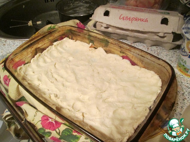 Залить пирог и в духовку на 30 мин. Духовку предварительно разогреть. Выпекать при тем-ре 220 град.