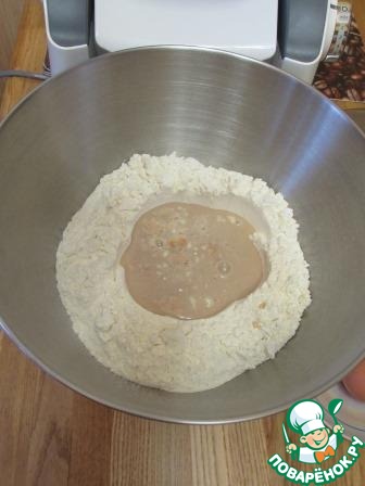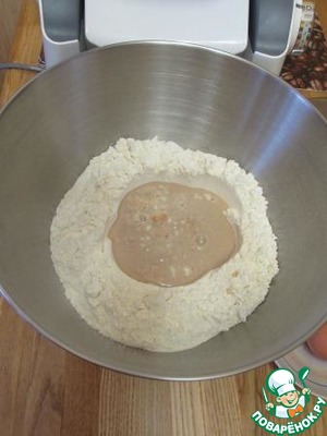 И так, в большую миску просеять муку и сделать углубление в центре, влить дрожжи с молоком и оставить на 30 мин. -