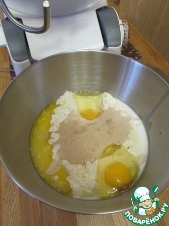 Дрожжи распустить в небольшом количестве молока, около 50 мл. Добавить сахар. -