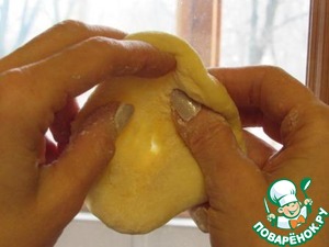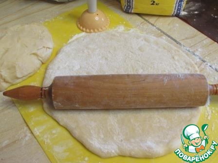 На присыпанной мукой поверхности раскатать тесто в пласт толщиной примерно 5-6 мм., тонко не нужно, но и сильно толстым его тоже не следует раскатывать. Для удобства я тесто разделила пополам, руки присыпала мукой.