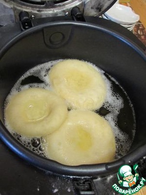 Жарила пончики во фритюрнице. Эти пончики готовятся, плавая в горячем масле (170-180 С). Если нет фритюрницы, то в глубокую кастрюлю с толстым дном налить масло, раскалить до указанной температуры и обжаривать со всех сторон. Проверить на температуру масло можно, опустив деревянную длинную шпажку в масло- если вокруг шпажки появились маленькие пузырьки, то масло набрало температуру для жарки.