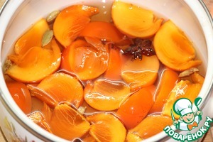 Далее загружаем дольки хурмы в сироп. Если у вас хурма очень твердая, то поварите её минут 10-15. Но не разваривайте! У меня же хурма была спелая, я её просто опустила в кипящий сироп и через 30 секунд выключила огонь.