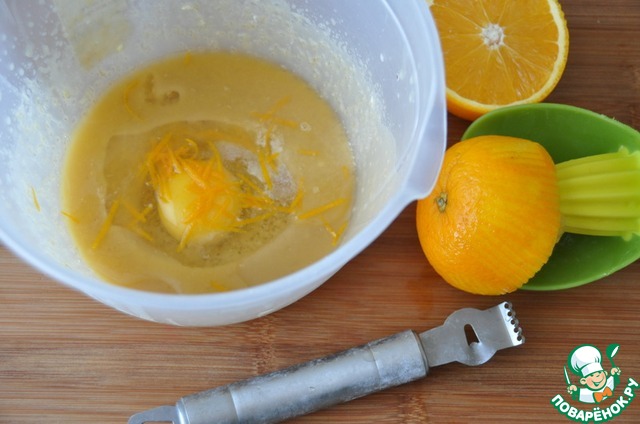 Добавляем яйцо, ванилин, цедру и сок половины апельсина. Слегка взбиваем.