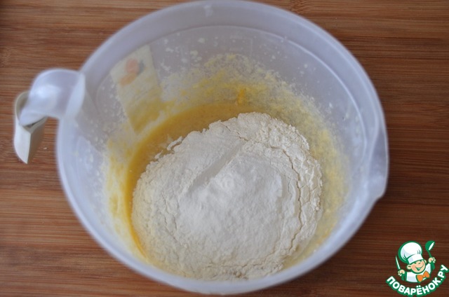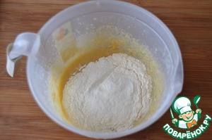 Добавляем муку и разрыхлитель, перемешиваем.