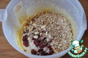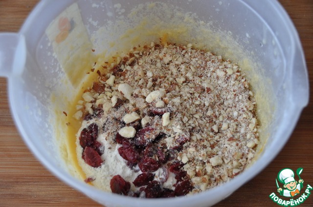 Миндаль подсушиваем на сковороде, измельчаем в крупную крошку, кладём в тесто, добавляем вяленую клюкву.