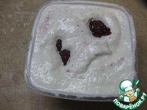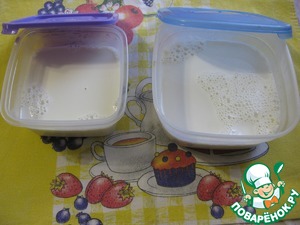 Остывшую молочно-яичную смесь разлить в контейнеры до половины, или в один большой, поставить в морозилку на 1-2 часа. У меня через час ничего не замерзло, и я решила провести эксперимент: содержимое одного контейнера взбила венчиком до увеличения в объеме и снова вылила в контейнер и убрала в морозилку.