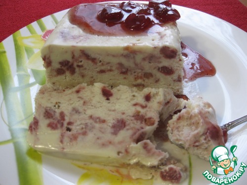 Украшаем по желанию, - у меня ягоды вишни из варенья, - можно посыпать шоколадной стружкой.