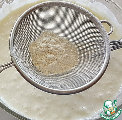 Просейте сюда же муку, ванильный сахар и разрыхлитель, всё хорошенько смешайте