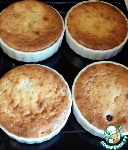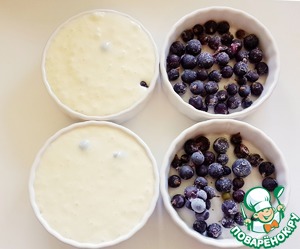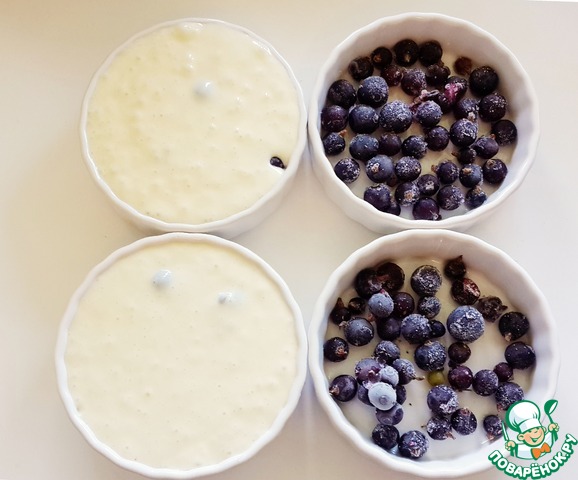 Выпекать пудинг можно в одной форме или порционно. Я делала порционно. Керамические формочки смажьте маслом. Выложите на дно ягоды (у меня замороженная черная смородина), посыпьте ягоды сахаром (примерно по 2 ч. л. на каждую формочку). Сверху на ягоды вылейте тесто. Наливайте не доходя 0,5 см до самых краёв. Пудинги при выпекании чуть поднимутся, но потом осядут