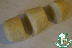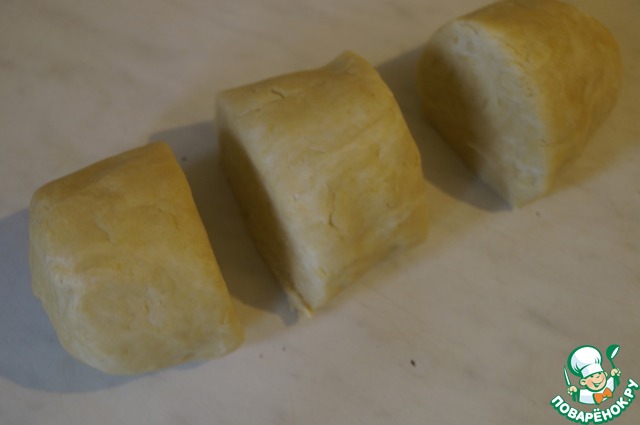 Тесто достать из холодильника, сформировать из него колбаску или прямоугольник и разделить на 3 равные части.