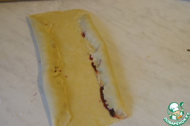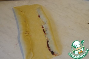 Обе части прямоугольника еще раз свернуть рулетом навстречу друг другу. Также поступить с оставшимся тестом. Выложить заготовки на противень застеленный пергаментом.