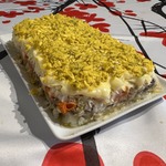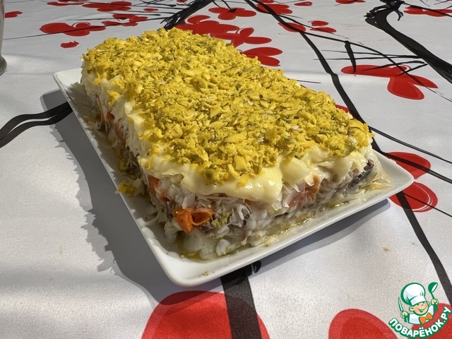 большую часть тёртого картофеля, затем рыбу (вместе с соком и маслом), лук, остальной картофель, майонез, морковь, майонез, белки яичные. Полностью обмазываем майонезом, обсыпаем яичным желтком. Ставим на час-два в холодильник, чтобы настоялся. Получается очень сочным и вкусным, особенно в сочетании с маринованным луком!!!