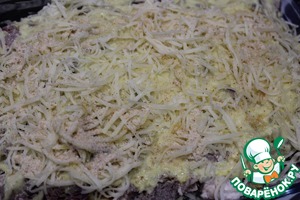 Мясо достать из холодильника и нарезать кусочками толщиной около 5 мм и сложить в один слой в смазанную 1 столовой ложкой растопленного сливочного масла жаропрочную форму. Слои можно будет повторять. Чем больше слоев, тем вкуснее будет мясо. Мясо посолить, если оно не соленое и поперчить. Натираем на терке сыр. У меня 2 слоя.