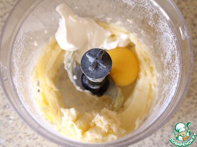 Песочное тесто я готовлю в блендере, очень удобно и быстро. Но можно, конечно, и руками :) В блендер поместить сливочное масло и сахарную пудру, взбить.