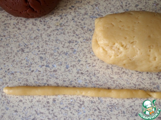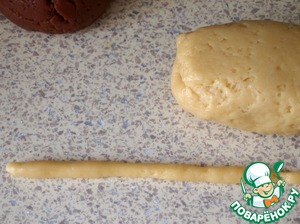Далее от белого теста отщипываем кусочки и скатываем в длинную колбаску. Размер на ваше усмотрение.