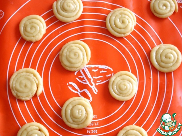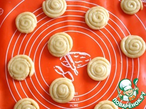 Колбаски скручиваем "улитками" и выкладываем на противень, застеленный бумагой для выпечки или силиконовым ковриком. Данная формовка послужит как бы "бульдожьими складками" :)