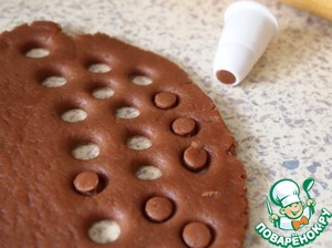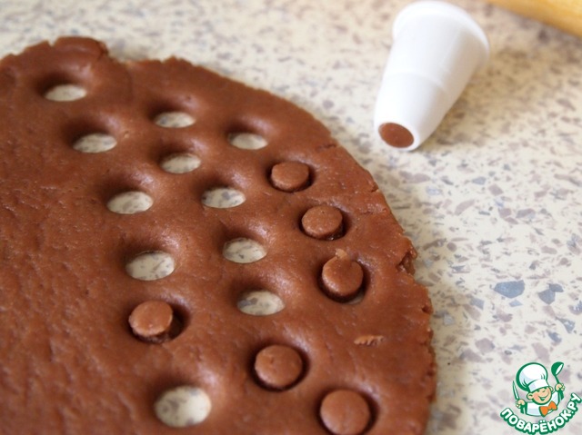 Далее раскатываем часть шоколадного теста и выдавливаем из него маленькие (глазки и носик) и большие кружочки.