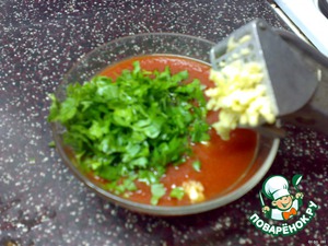 В томатный сок выдавливаем чеснок, высыпаем мелко нарезанную петрушку, все хорошо перемешиваем и заливаем нафаршированные баклажаны.