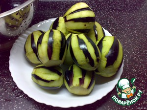 Баклажаны очищаем полосочками, как на рисунке. При готовке это поможет сохранить их форму и в то же время наши баклажаны будут очень нежными и приятными на вкус.