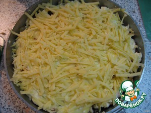 Залить сметанным соусом, посыпать сыром и отправить в прогретую духовку на 15 минут при температуре 175 градусов.
