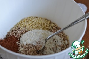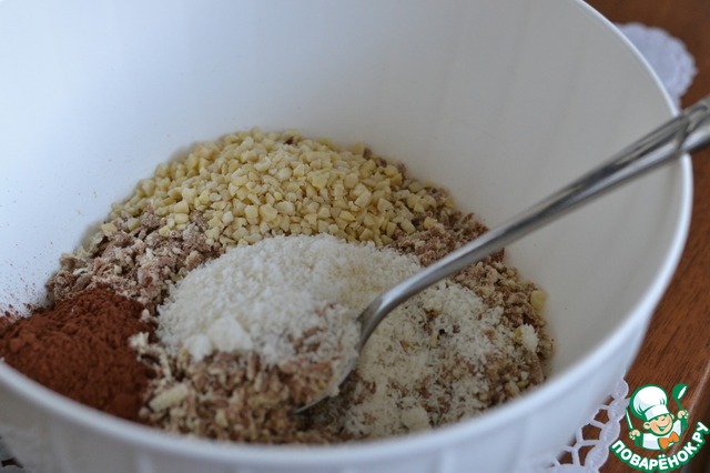 В миске смешать вафли, кокос, какао-порошок и орехи.