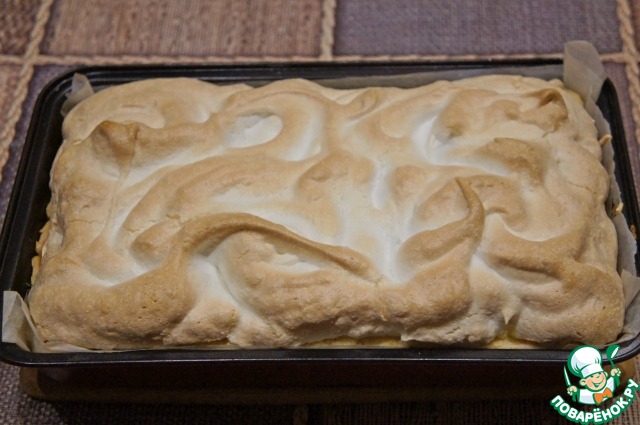 Выпекать пирог при температуре 180*С около 45 минут. Чтобы безе не подгорало, как только оно подрумянится, надо накрыть пирог фольгой.