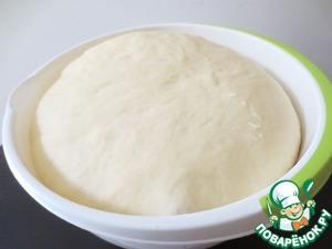Рабочую поверхность присыпать мукой и положить тесто. Месим до получения гладкой массы. Добавляем масло и вновь месим тесто 15-20 минут.