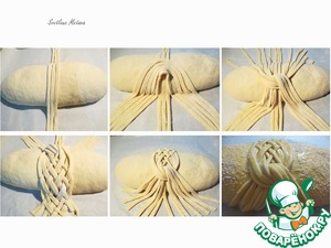Оформляем батон. Поперек батона выкладываем три полоски. После чего с одной стороны, формируя скобки, выкладываем 5 полосок. Затем внахлест кладем еще 5 полосок. С одной стороны заплетаем полоски, концы отрезаем и заворачиваем под батон. С другой стороны также концы полосок заворачиваем под батон.