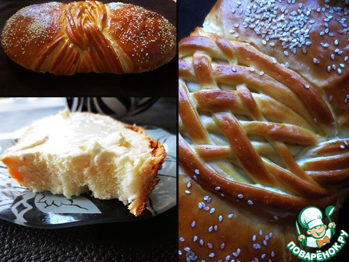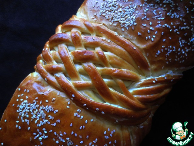 Смазываем хлеб взбитым желтком, смешанным с молоком, накрываем, оставляем на время, пока хлеб не увеличится в размере. Перед выпечкой посыпаем кунжутом.