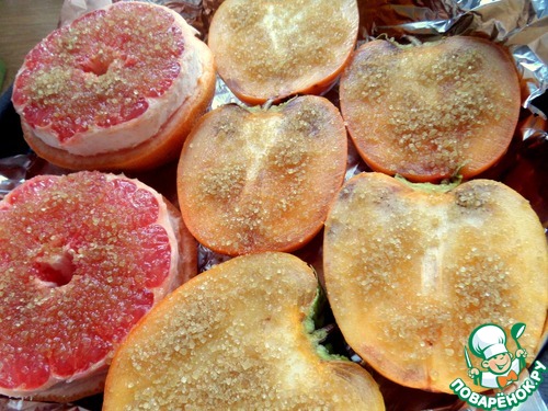 Давно хотела попробовать запечь под сахаром фрукты, так как холода пришли и тянет почаще включать духовочку. Мне больше понравился в запечённом виде грейпфрут: ушла горчинка и он стал более сладким. Хурма тоже получилась с новым вкусом. Едим с мороженым или взбитыми сливками.