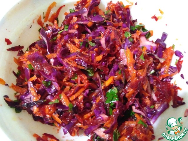Сегодня предлагаю попробовать сочный и лёгкий салат! Овощи берём сырые: морковь, свеклу и краснокочанную капусту! Калорийность такой капусты весьма невысока – всего около 26 ккал на 100 г, но зато у неё очень богатый витаминный и минеральный состав! Бета-каротина в 4 раза больше, чем в белокочанной – уже поэтому на неё стоит обратить внимание! Сегодня мой салат для всех, кто любит "похрустеть" и в подарок в День рождения Олечке (o roma)!