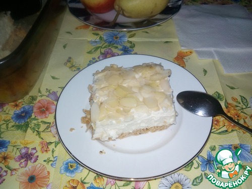 Соединить взбитые сливки с уже охлажденным молочным кремом и еще раз взбить. Выложить получившийся воздушный крем на песочную основу и еще раз охладить.