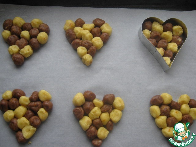Отщипываем от двух видов тесто маленькие кусочки (примерно 2 гр.), скатываем шарики и укладываем их в формочку, потом форму убираем.