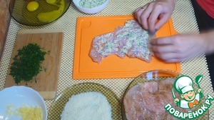 • Куриную грудку хорошенько раскрыть, удалить лишние кусочки (чтобы получился ровный кусочек), посолить, добавить приправу. Дать постоять минуты 3, пока готовите начинку.