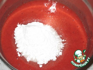Сразу же распустить набухший желатин (2 ст.л. ), влить в клубничное пюре, хорошо перемешать и остудить до комнатной температуры. Для быстроты, можно поставить в большую посуду с холодной водой.