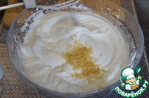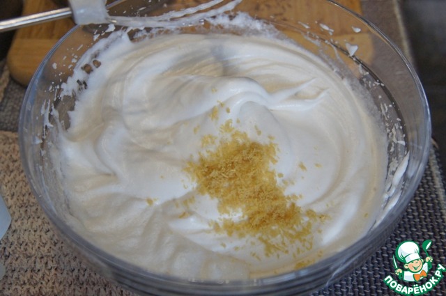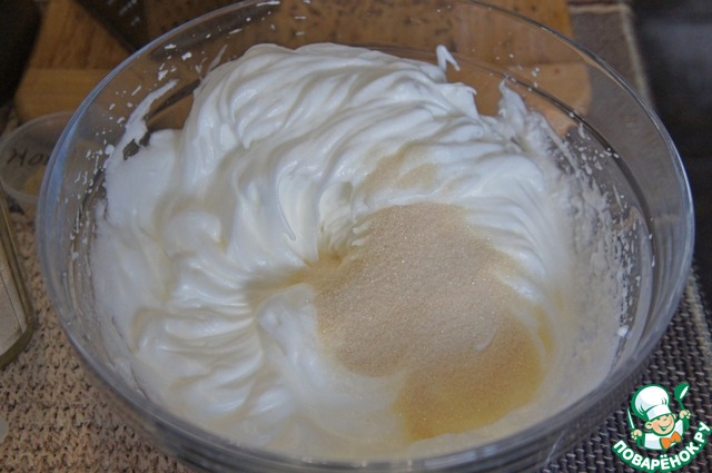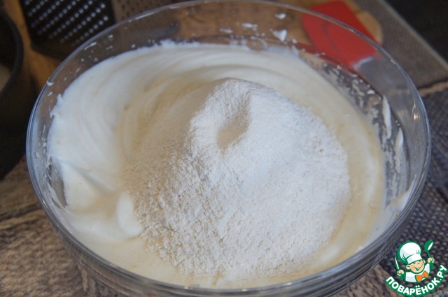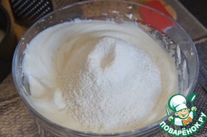 Просеять муку, смешанную с разрыхлителем, осторожно смешать методом складывания. Не стоит добиваться совсем уж однородного состояния, главное, чтобы белки не осели.