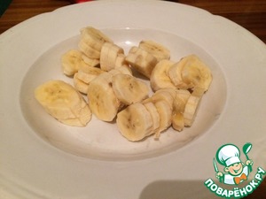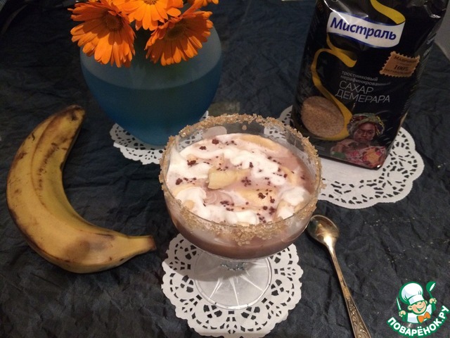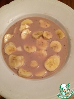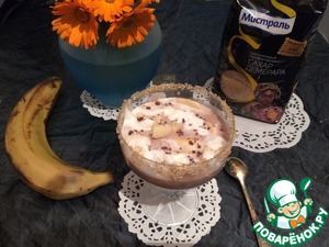 • Положить в высокий стакан, креманку. Украсить перед подачей взбитыми сливками (сметаной)и кружочками банана.